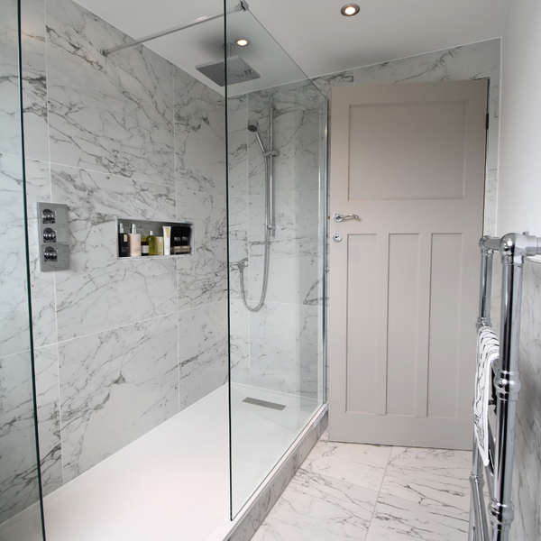 The use of carrara marble tiles with their soft grey shading creates a timeless elegance and opens up this room to create a light space.